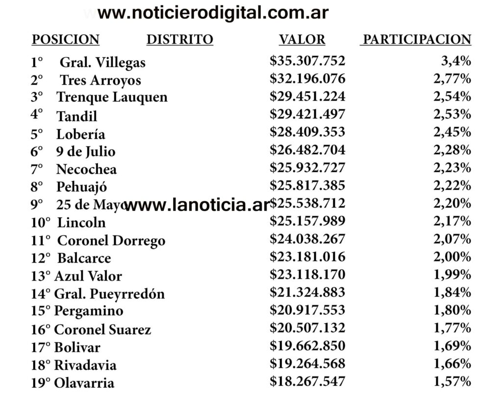 Desde nuestros medios de comunicación www.lanoticia.ar y el www.noticierodigital.com.ar posicionamos los mejores partidos según su ubicación correspondiente en la POSICION – DISTRITO – VALOR – PARTICIPACION